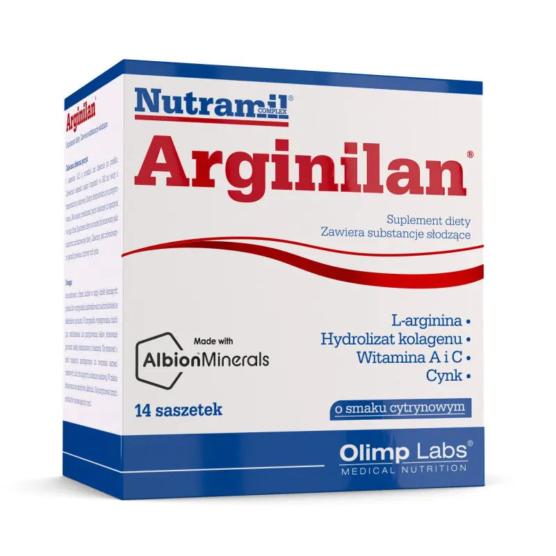 Olimp Arginilan to kompleksowa formuła łącząca L-argininę, kolagen, cynk oraz witaminy C i A, stworzona z myślą o osobach dbających o układ krążenia, regenerację, kondycję skóry oraz prawidłowe funkcjonowanie układu pokarmowego. To wszechstronne wsparcie dla organizmu przy intensywnym trybie życia i zwiększonym wysiłku.