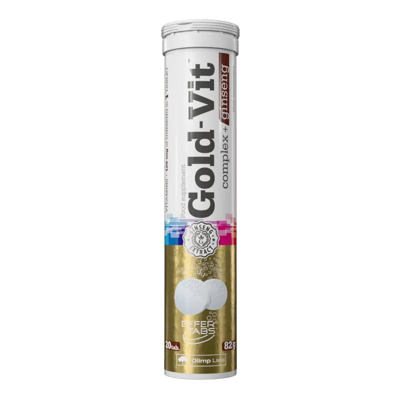 Olimp Gold-Vit Complex + Żeń-szeń to suplement diety w formie tabletek musujących, łączący kompleks witamin z ekstraktem z żeń-szenia. Wspiera energię, koncentrację, odporność i wydolność organizmu, pomagając utrzymać wysoką sprawność każdego dnia.