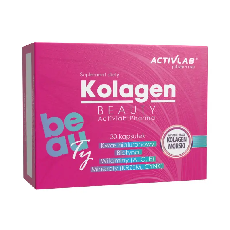Activlab Pharma Kolagen Beauty to suplement diety z kolagenem morskim, kwasem hialuronowym, witaminami i minerałami, który wspiera jędrność skóry, mocne włosy i paznokcie, a także kondycję stawów i kości – dla piękna i zdrowia od wewnątrz.