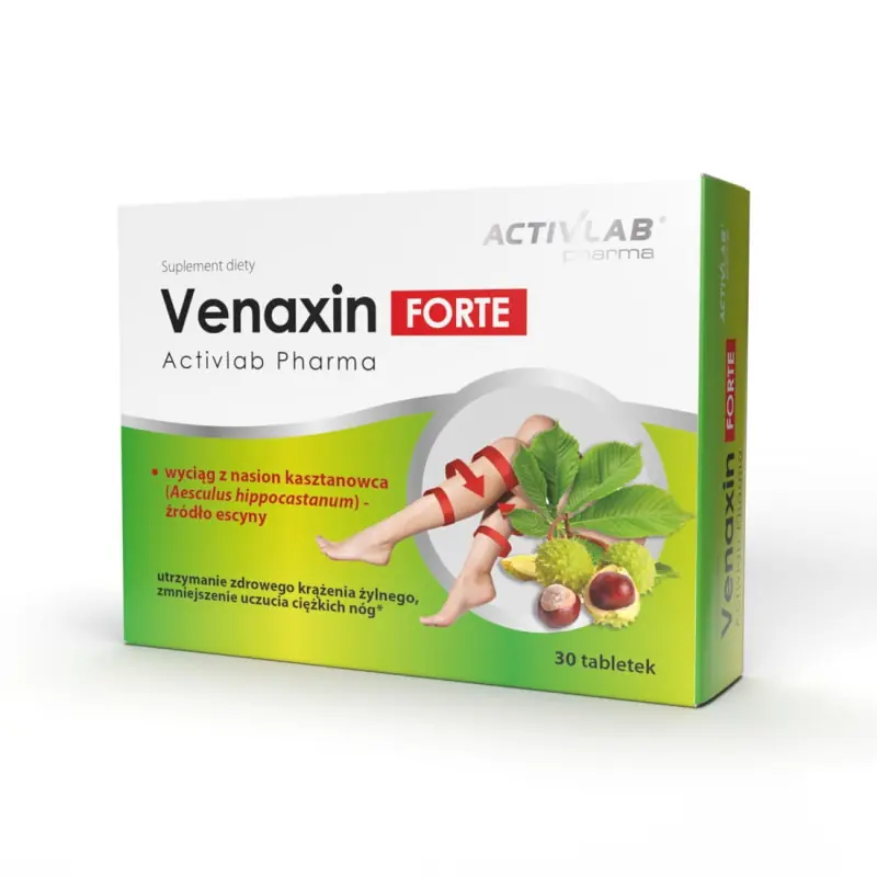Activlab Pharma Venaxin Forte to suplement diety z wyciągiem z nasion kasztanowca, który wspomaga krążenie żylne, redukuje uczucie ciężkich nóg i zmniejsza zmęczenie. Idealny dla osób prowadzących siedzący lub stojący tryb życia. Poprawia komfort nóg i wspiera ich codzienną kondycję.