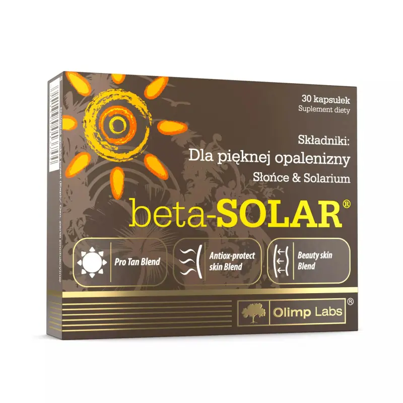 Olimp Beta-Solar to suplement diety wspierający naturalną opaleniznę, ochronę skóry przed stresem oksydacyjnym i zdrowy wygląd skóry. Dzięki starannie dobranym składnikom aktywnym wspomaga pigmentację, elastyczność i młody wygląd skóry podczas ekspozycji na słońce.